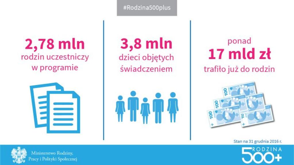 Wsparciem z rządowego programu „Rodzina 500 plus” do końca grudnia 2016 roku objęto już ponad 3,8 mln dzieci do 18 lat. Do 2,78 mln rodzin trafiło ponad 17 mld zł.Najwięcej dzieci objętych wsparciem jest na Mazowszu (ponad 551,4 tys.), na Śląsku (prawie 381,5tys.) i w Wielkopolsce (ponad 377,8 tys.).