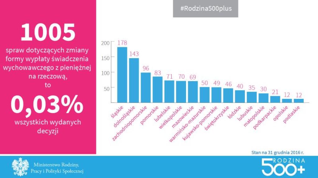 Od startu programu „Rodzina 500 plus” prowadzonych było zaledwie 1 005 spraw dotyczących zmiany formy wypłaty świadczenia wychowawczego z pieniężnej na rzeczową, co stanowi 0,03% wszystkich wydanych decyzji.