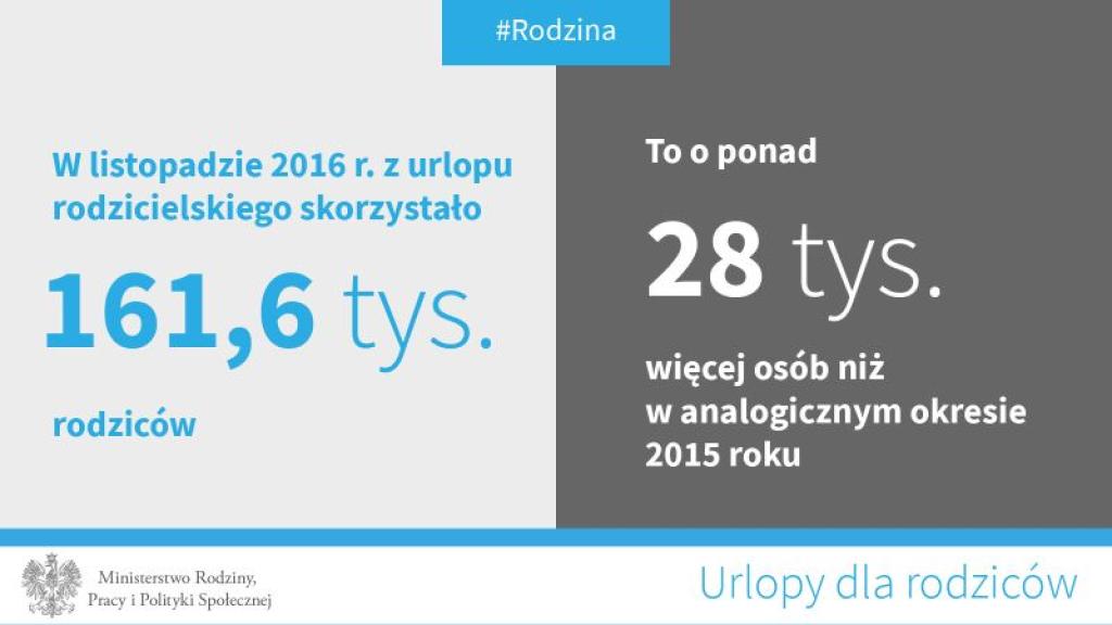 W listopadzie 2016 r. z urlopu rodzicielskiego skorzystało 161,6 tys. rodziców. To o ponad 28 tys. więcej osób niż w analogicznym okresie ubiegłego roku. Z urlopu ojcowskiego skorzystało 17,3 tys. ojców. W okresie od stycznia do listopada 2016 r. z urlopu ojcowskiego skorzystało 136,6 tys. ojców.